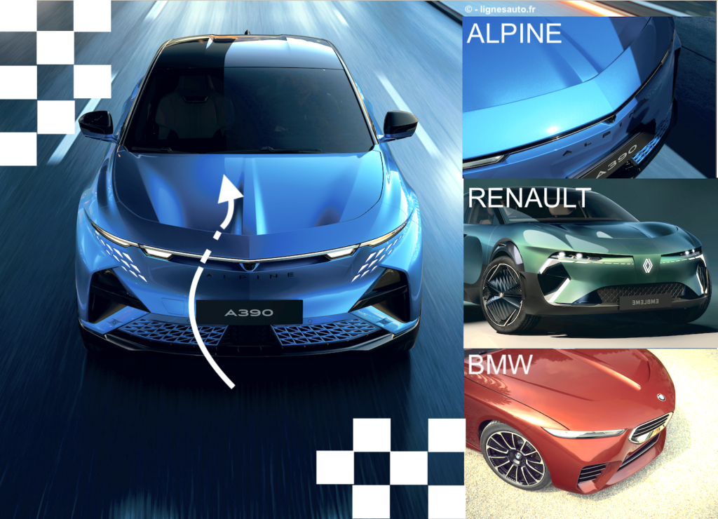 Ce concept de lame en bout de capot peut être interprété de plusieurs façons. Sur son nouveau concept-car Speedtop, BMW capte l’air en amont par le biais des deux naseaux de la calandre. Renault sur son concept-car Emblème opère plus directement, à la façon d’Alpine, en captant l’air de part et d’autre des optiques, en partie supérieure du soft-nose. Il semblerait que le concept soit efficace car il se développe sur de nombreux projets. Alpine le bascule en série avec son A390.