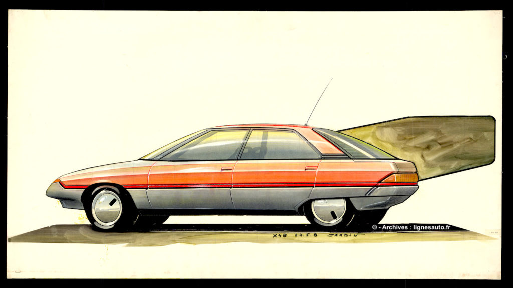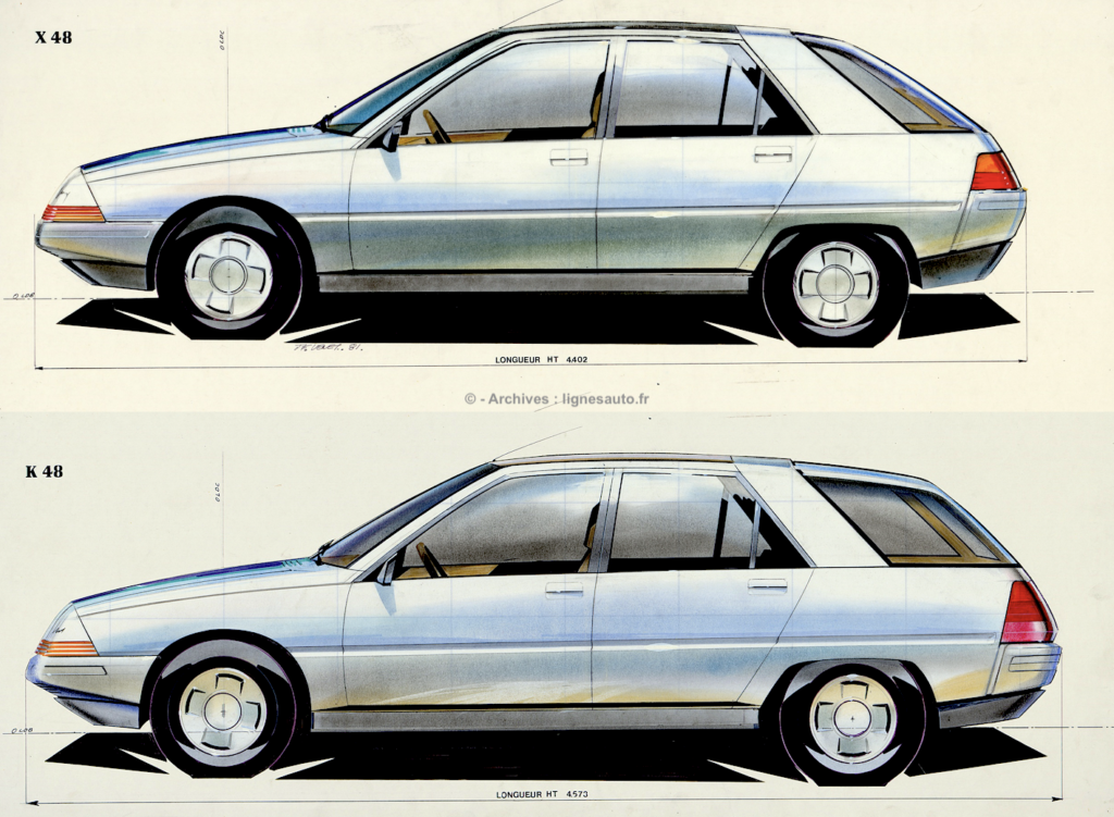 En concurrence interne avec Michel Jardin, Jean-François Venet propose non pas une mais trois silhouettes du programme X48 : une berline bicorps, un break (ci-dessus) et une berline tricorps (ci-dessous) plus classique. On reconnait la patte de ce grand designer dans ses dessins, dont l’un s’inspirera très fortement d’une esquisse effectuée lors de l’étude de la Renault 25; une esquisse enfantée par ses soins ! De son côté, Robert Opron pousse les designers d’AMC (American Motors Corporation) aux États-Unis pour qu’ils proposent leur propre vision.
