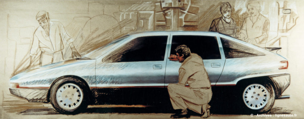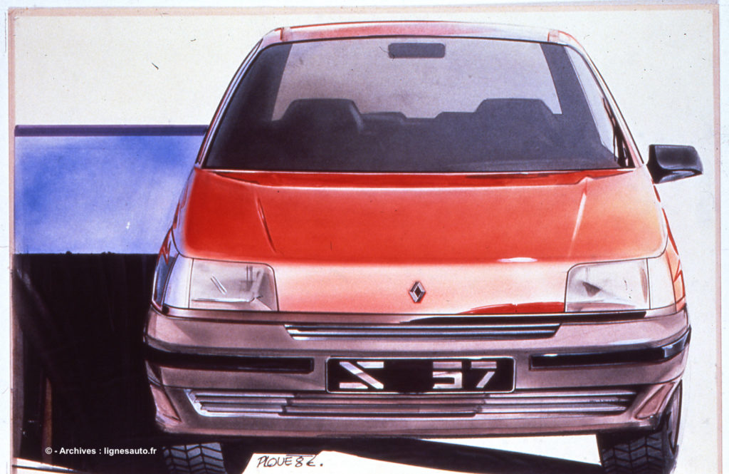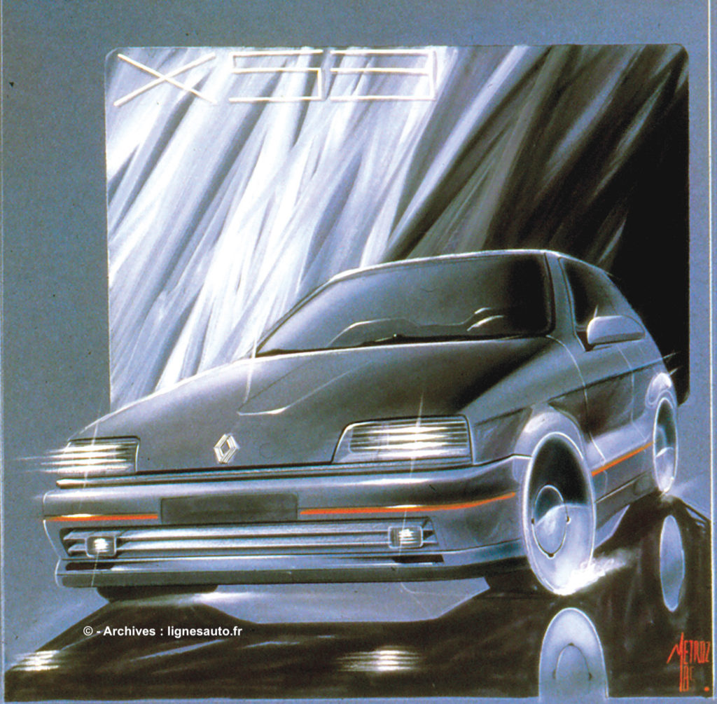 Dès 1983, Giugiaro tient à remercier la Régie avec un beau cadeau conçu entre les études des Renault 21 et Renault 19 : son concept-car Gabbiano (ci-dessus) conçu sur la base de la Renault 11 (appelé “11 SC”) et dévoilé au salon de Genève. Après ces deux succès, voilà que pointe à l’horizon le plus grand programme des années 1980 pour Renault : le renouvellement de la Renault Supercinq avec celle qui deviendra la Clio en 1990 et connue sous le nom de projet X57 (ci-dessous, dessin de Jean-Pierre Ploué).