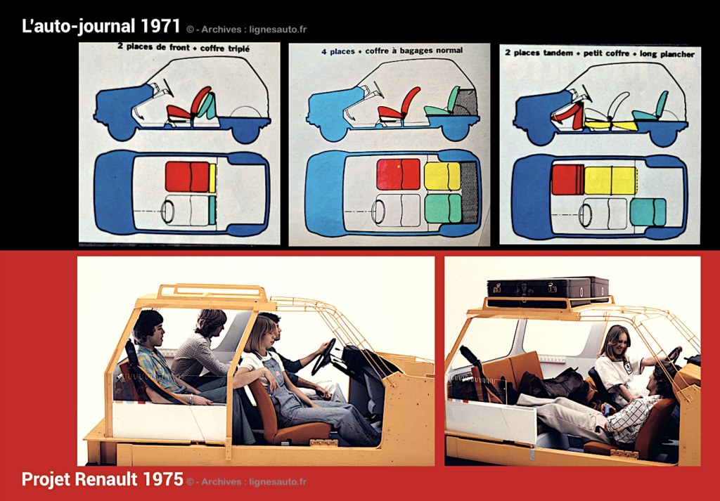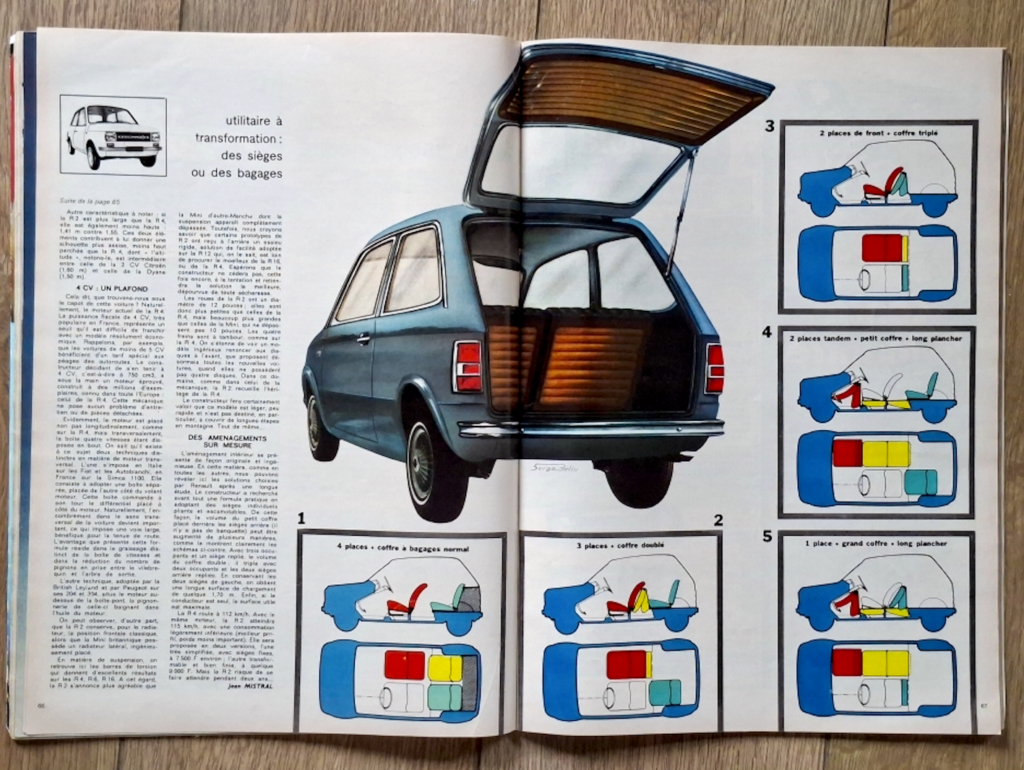 Gilles Guérithault se serait-il trompé ? Connaissant le personnage, on en doute ! Il faut donc aller chercher ailleurs l’origine de ce papier. Et c’est en découvrant dans l’article de mai 1971 les dessins de la modularité à bord de la R2 que l’on comprend mieux, même s’il demeure une énigme. Je m’explique : en mai 1971, l’auto-journal publie le sujet sur la R2 avec une pleine double page sur la modularité exceptionnelle de cette petite voiture « plus large que haute ».