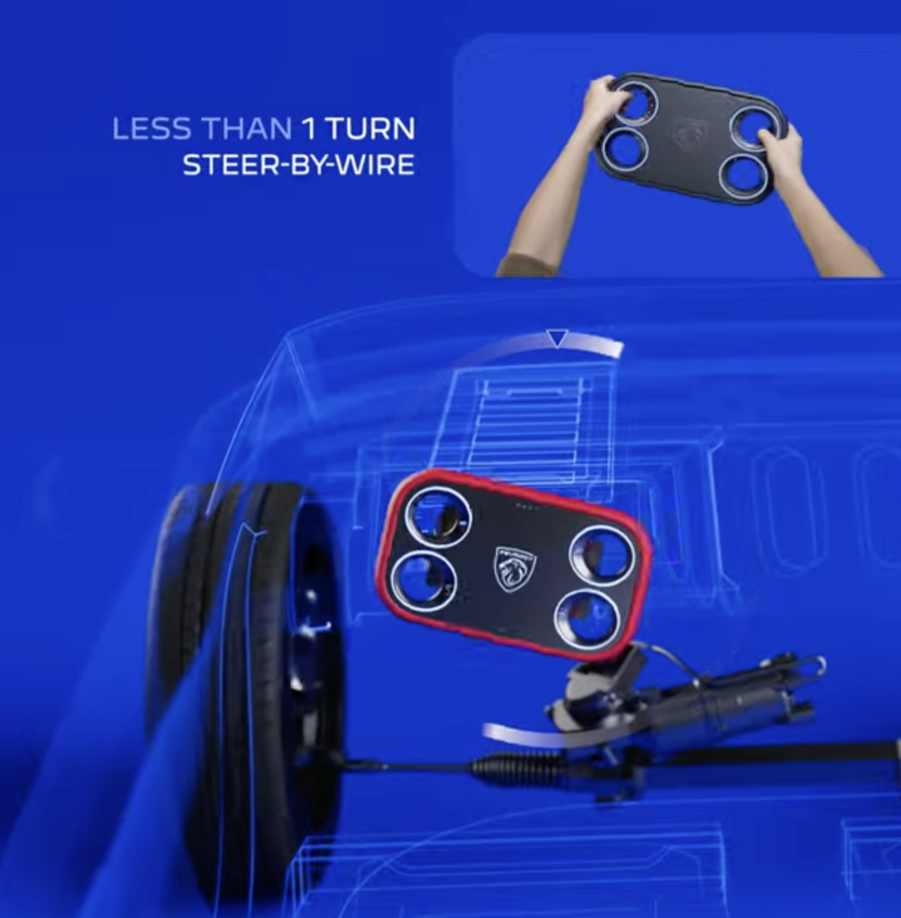 L’architecture sans lien mécanique de la direction, dite steer by wire ouvre le champ des possibles dans le dessin des habitacles du futur : plus de place, moins de pièces et surtout, une absence totale d’écran puisque Polygon projette toutes les infos sur le pare-brise via une dalle de Micro-LEDs située derrière Hypersquare. Peugeot ne propose pas une vision, mais bel et bien la réalité d’une expérience à bord réinventée, puisque le duo 208/2008 bénéficiera de cette innovation. En 2027.